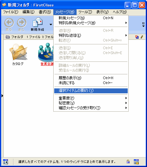メッセージやドキュメントなどのオブジェクトを複数選択し、それらの内容をまとめて1つのウィンドウに表示するには、[メッセージ]>[選択アイテムの要約]を選択してください。ドキュメントが一時的に作られ、その中にオブジェクトの内容が連続して表示されます。このドキュメントは一度閉じると利用できなくなります。