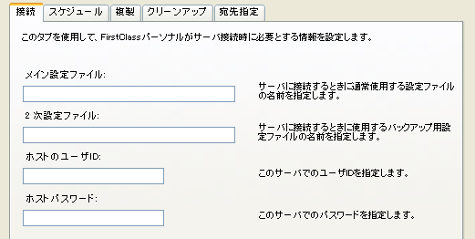 このタブを使用して、FirstClassパーソナルとサーバ間の接続情報に関する設定を行います。
