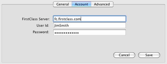 Use this tab to detail your FirstClass account information, allowing FirstClassSync to access your FirstClass account.