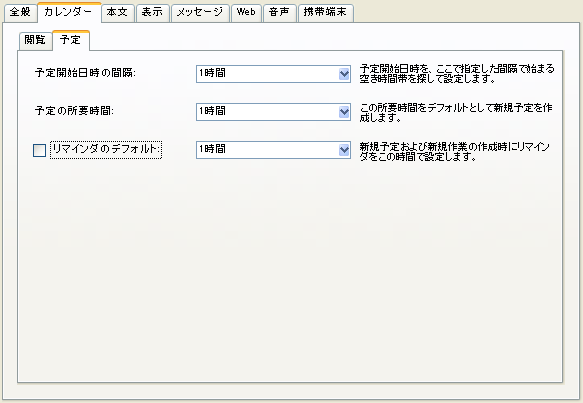 このタブを使用して、予定の時刻とリマインダのデフォルトを設定します。
