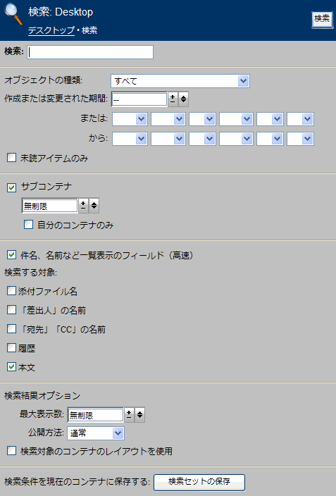 検索対象とするオブジェクトの種類です。[すべて]を選択すると、カレンダーの予定などのオブジェクトに加え、コンテナ、ドキュメント、メッセージ、およびファイルが検索対象となります。