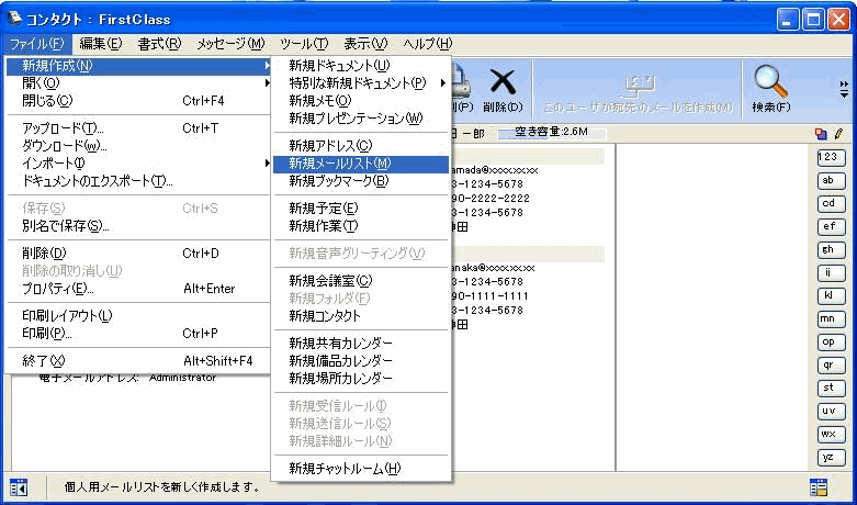 1       [ファイル]>[新規作成]>[新規メールリスト]を選択します。