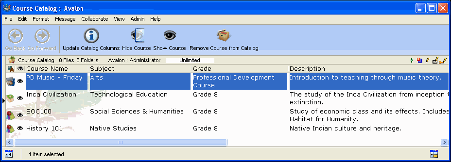 Once a course has been fully developed, you can add it to the Course Catalog from the Courses in Development area. However, you still have the ability to reveal or hide the course from teachers using the associated toolbar buttons.