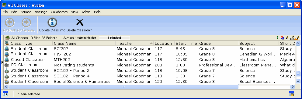 This area displays a list of all the Classes that any of the teachers have added to their My Classes area.