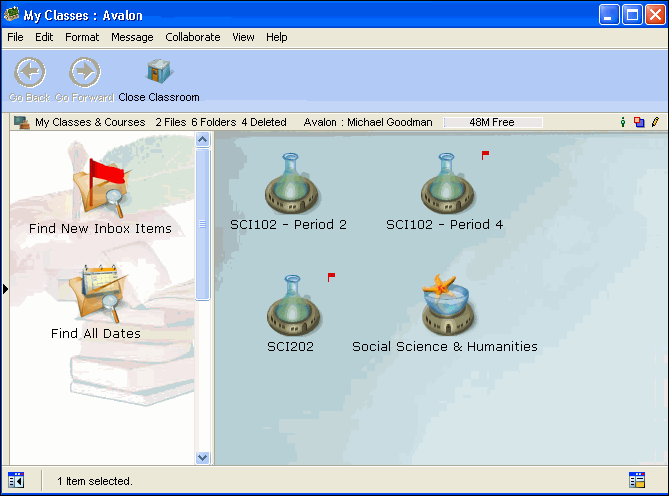 From here, the teacher can manage his classes (including adding a new classroom from the course catalog or closing a classroom) as well as any courses he is developing, or perform a search for specific information such as new assignments that have been submitted. From here, the student can access any of his classes, journals, or project areas, or perform a search for specific information such as new assignments that need to be completed.