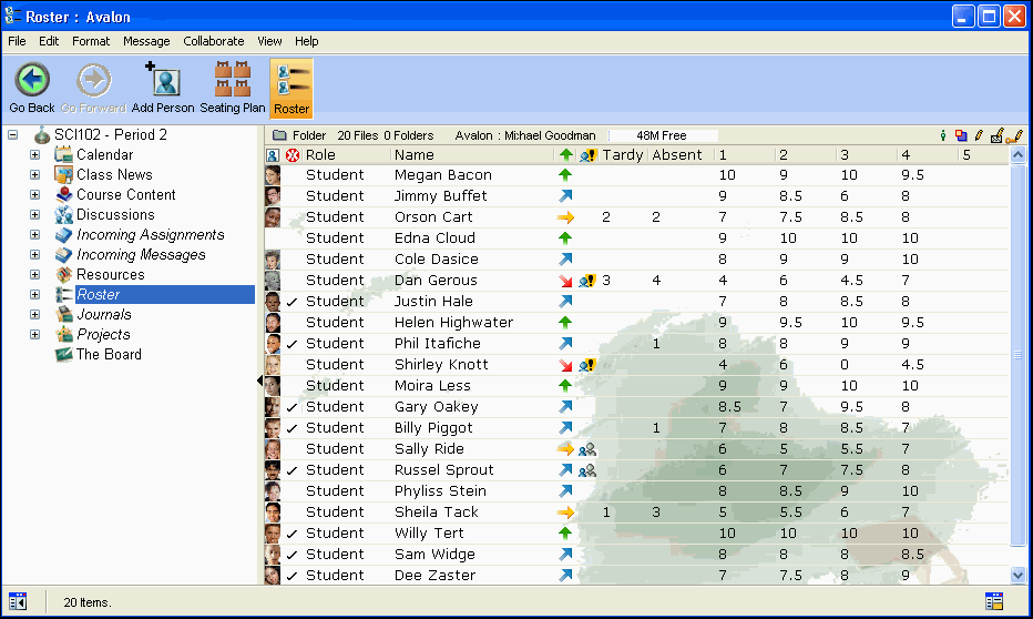 The class Roster displays a list of students in the class. From here, the teacher can add or remove students, view student information by double-clicking a student, track the status of students who require special assistance, create a seating chart, and view and add marks. At a glance, the teacher can see information about each student (for example, performance level or medical issues).
