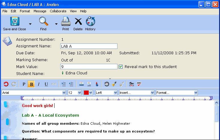 From the Incoming Assignments area, the teacher can open any submitted assignment, assign a mark and add comments directly in the body of the message. The teacher controls when the assignment is revealed to students. If she wishes, she can reveal all of the marks at once.