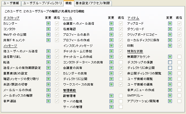 このタブを使用して、このユーザに独自の権限を設定します。[変更]欄のチェックボックスにチェックを入れると権限が有効になり、空白にすると無効になります。また、網掛けにすると所属グループの設定が適用されます。[現在]欄のチェックボックスは、ユーザが現在その権限を持っているかどうかが、所属するユーザグループの権限設定に基づいて表示されます。