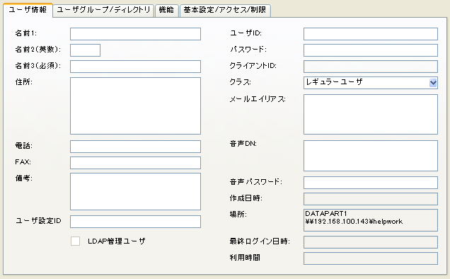 20100519_185910_0.png注意            [システムプロファイル]で[同一ユーザ名の使用を禁止]を選択している場合、異なるユーザを同じ名前でディレクトリに登録することはできません。[名前1]、[名前2]、[名前3]の3つのフィールドに入力する名前が他のユーザと重複している場合、このユーザアカウントを保存しようとしてもエラーメッセージが返されます。少なくとも1つのフィールドの内容を変更してください。