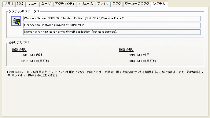 このフォームでは、FirstClassサーバのステータスとアクティビティに関する情報を表示します。