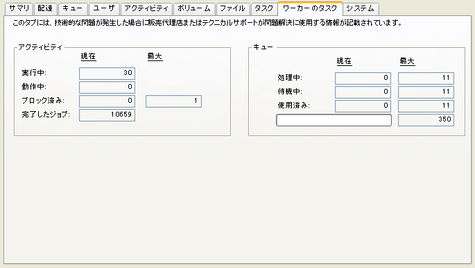 ディスクに関連するサーバ動作のパフォーマンスについての情報が表示されます。この情報は、カスタマーサポートがシステムのパフォーマンスに関する問題を調べる際に使用することがあります。