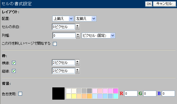 セルがある列の幅です。 2番目のフィールドで、この幅を表全体の幅に対する割合(%)で指定するか、絶対値(ピクセル)で指定するかを選択してください。 ヒントある1つの列のサイズは固定し、他の列はウィンドウに合わせてサイズが変わるようにするには、固定する列の幅を絶対値