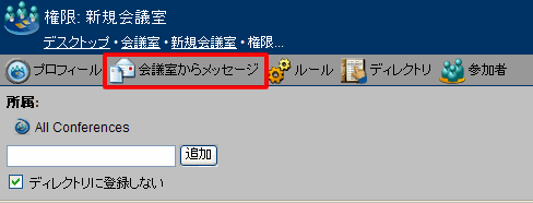 また、登録ユーザだけに投稿を許可しているメーリングリストもあります。これらのメーリングリストでは、会議室を使用するユーザではなく、会議室自体が登録ユーザであるとみなされます。したがって、会議室から直接メーリングリストにメッセージを送信したり、メーリングリストのメッセージに直接返信したりすることはできません。これらのメーリングリストに投稿するには、会議室の[権限]フォームの[ 会議室からメッセージ]ボタンを使用する必要があります。