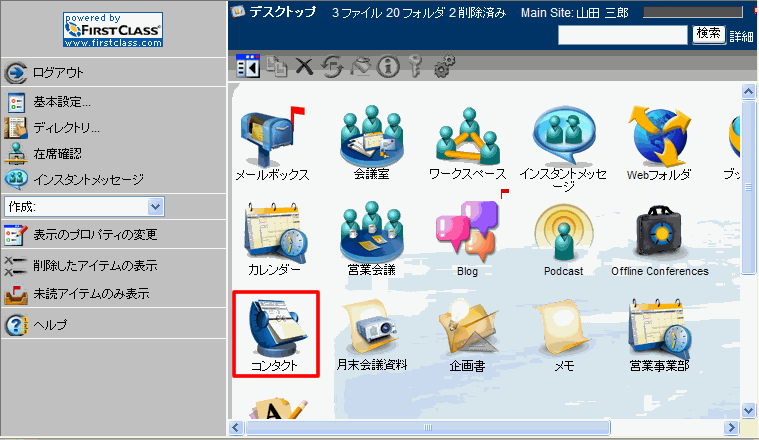 すべてのFirstClassユーザのデスクトップには、個人用の[コンタクト]フォルダが用意されています。[コンタクト]フォルダには、自分で使用するためのコンタクトとメールリストを登録します。