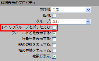 [表示のプロパティ]フォームの[詳細表示のプロパティ]セクションで[すべてのグループを折りたたむ]を使用します。